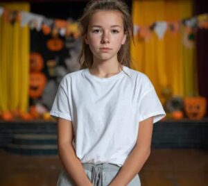 She didn’t enter the room so much as slip into it, quiet and invisible, like a brushstroke that didn’t quite dry. While everyone else shimmered in glitter and masks, Ellie wore plain gray pants and a white T-shirt. Her ponytail was tight, her eyes fixed on the floor. She looked like someone who’d shown up to the wrong party.