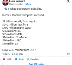 In a detailed post shared on his X (formerly Twitter) account, Senator Sanders summarized what he called “a staggering accumulation of wealth unprecedented for a sitting president.” His post listed Trump’s reported 2025 earnings as follows: