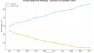 A new CNN/SSRS national poll, conducted October 27–30 among 1,245 adults, finds only 37 percent of Americans approving of Trump’s performance — down ten points since February and one of the lowest marks of his presidency. Disapproval now stands at 63 percent, nearly matching his post-January 6 low.