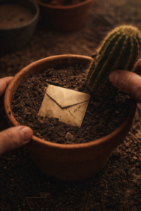 Weeks went by. Caring for the cactus became part of my routine. One afternoon, as I was repotting it, I noticed something hard beneath the roots. I froze. Hidden in the soil was a small, sealed envelope, aged and fragile.
