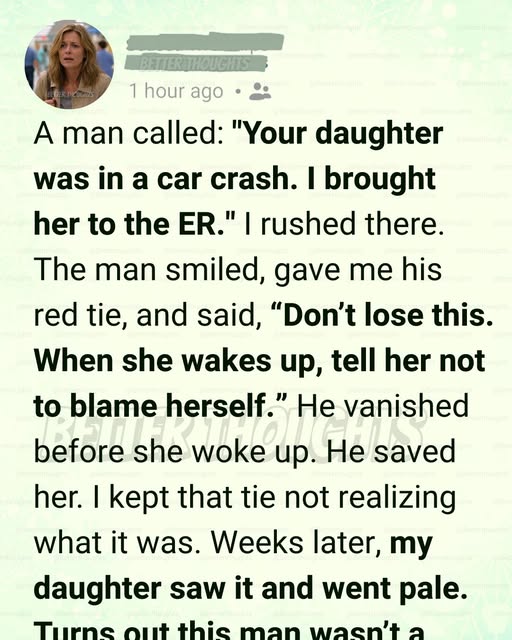 “There’s been a car crash. Your daughter was hit leaving her workplace. I pulled her from the vehicle and brought her to the ER. You need to come now.”