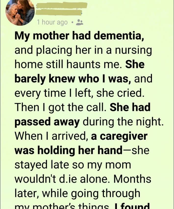 The story centers on a woman who made the painful decision to move her mother, whose dementia had progressed significantly, into a nursing home when it was no longer safe for her to remain at home. Over time, memory loss, confusion, and wandering had made everyday life increasingly difficult and dangerous.